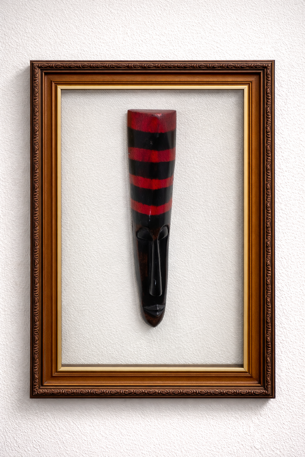 A sleek African wooden face with bold red and black horizontal stripes, featuring a long, elongated form and minimal facial details. It conveys strength, identity, and cultural symbolism, presented in a refined framed display that enhances its modern artistic appeal