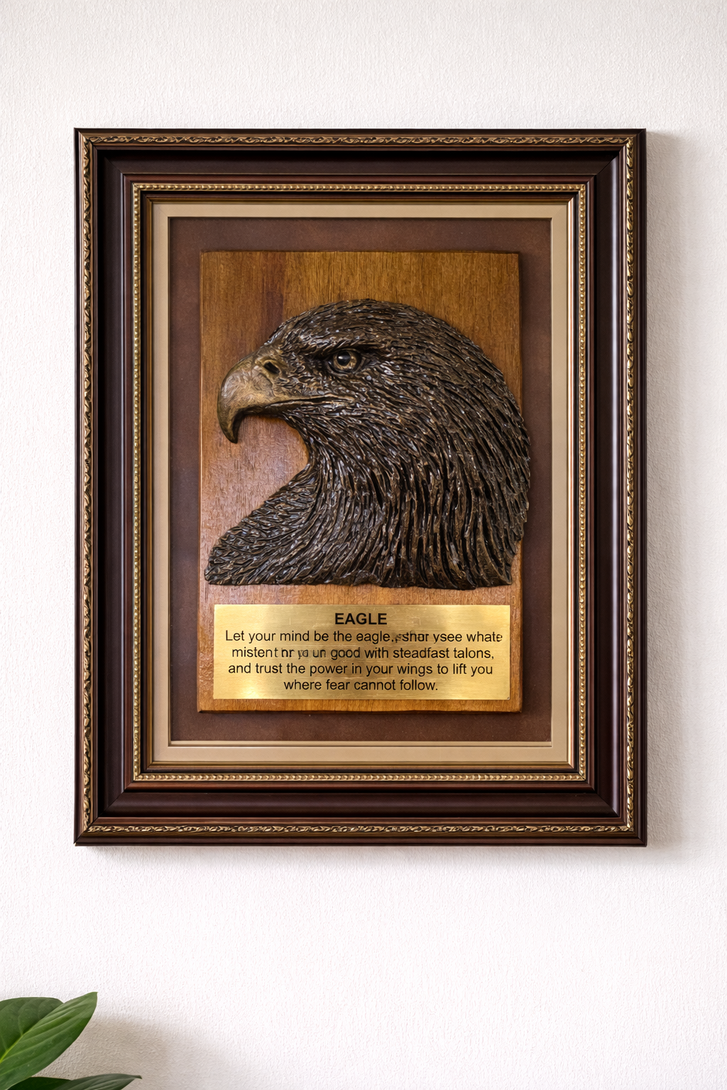 This striking eagle relief represents clarity, focus, and elevated perspective. With its sharp gaze and finely textured form, the piece embodies the power of foresight and inner strength. Set against a warm wooden backdrop, it inspires one to rise above fear, trust their instincts, and pursue their path with confidence and unwavering vision.